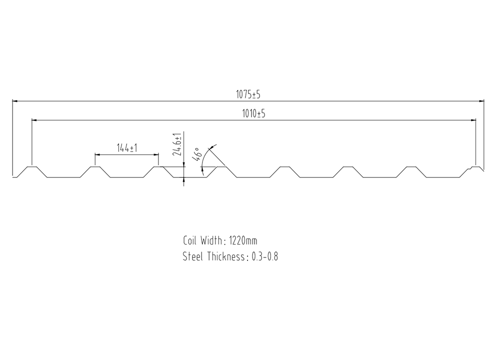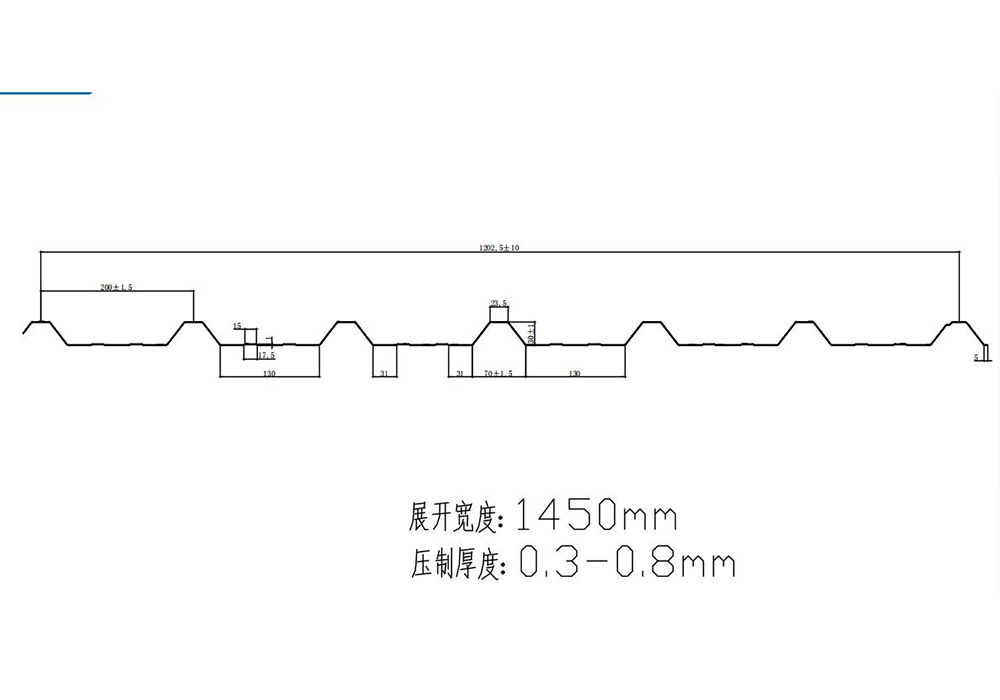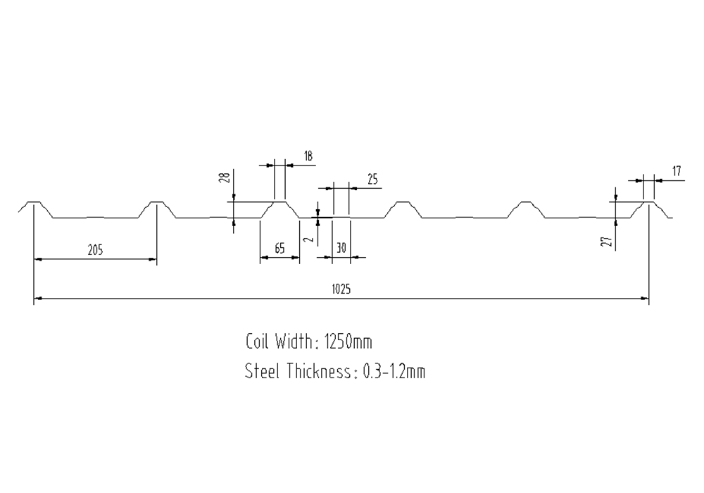The normal thickness range of roof panel roll forming machine is 0.2mm-0.8mm, the standard or more used in international market is Gauge 26 (0.45-0.5mm), working raw material is Aluminum, PPGI, Galvanized steel, etc. We confirm machine’s configuration according to your drawing, specially the pitch and height of each wave.