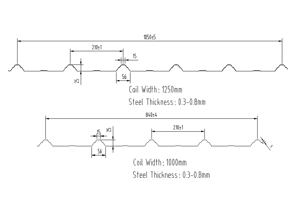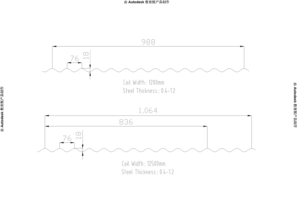 You can choose two different kind of profile drawings as well as corrugated sheet drawing, but one time only can produce one layer profile . There is one clutch as one side of the machine, and we just need simply to move one handle wheel to make other layer profile.