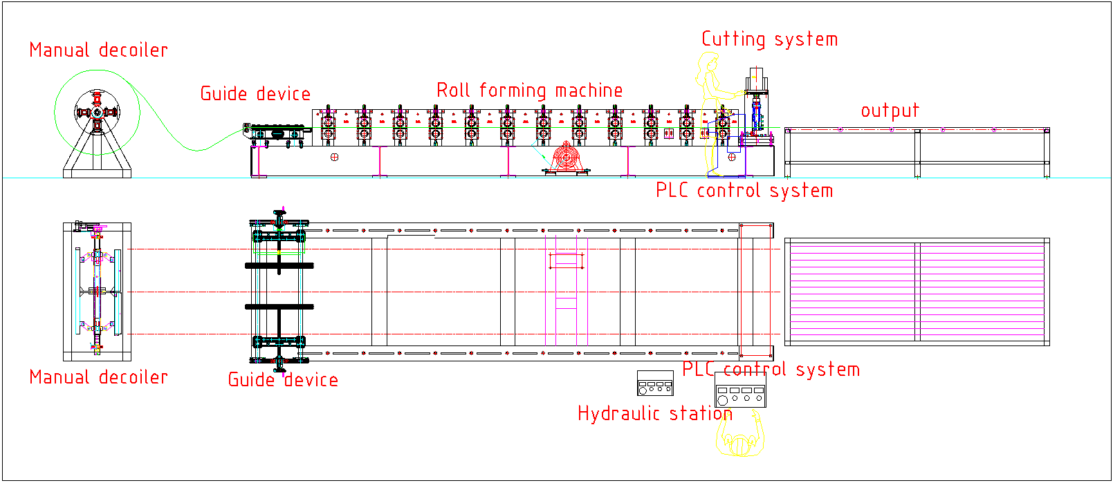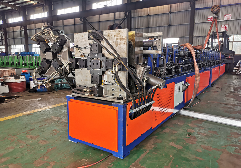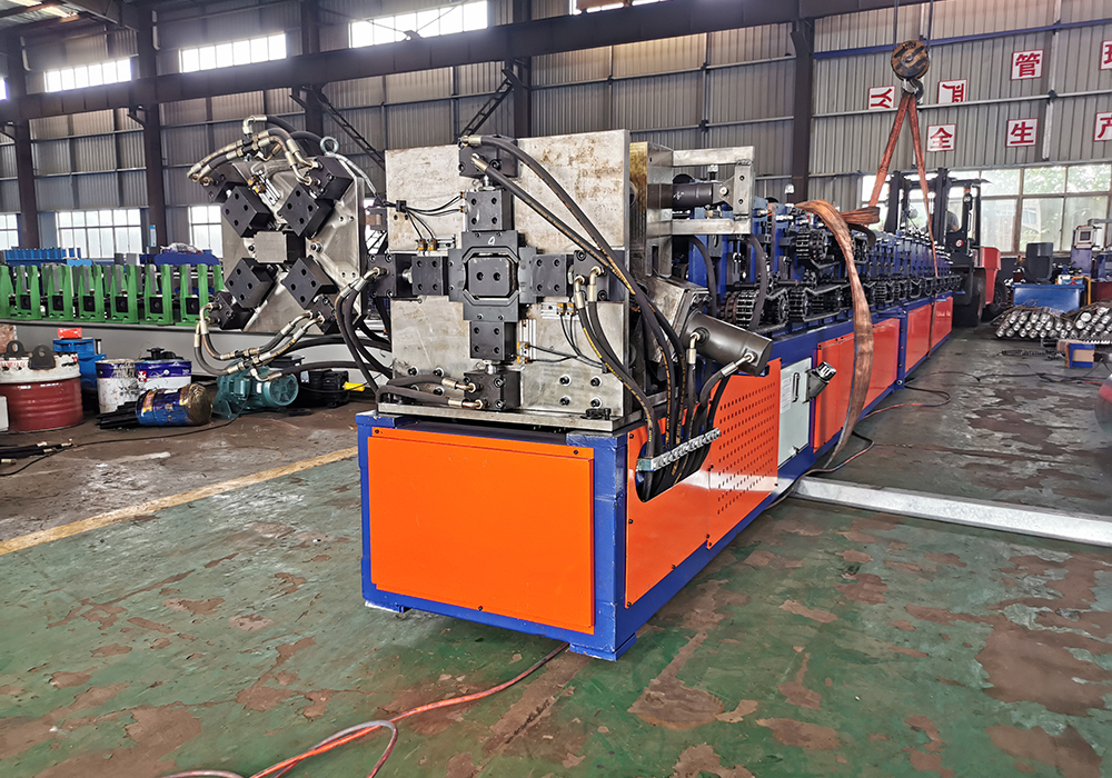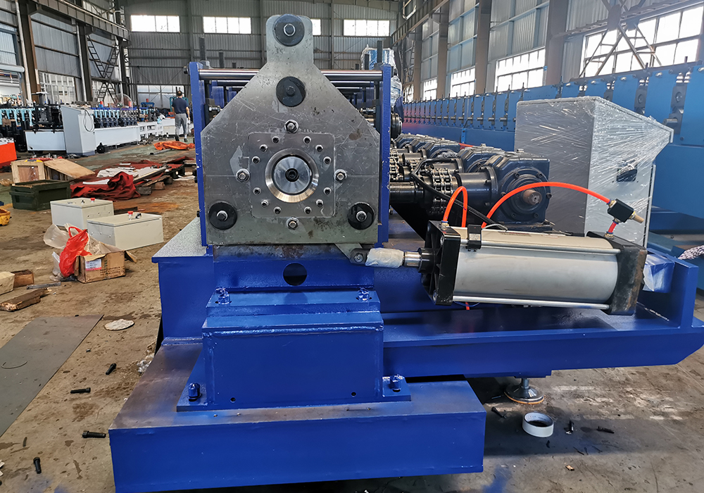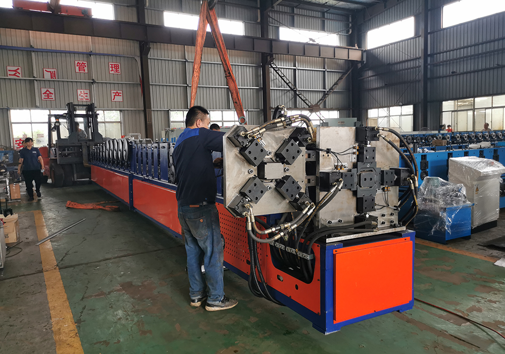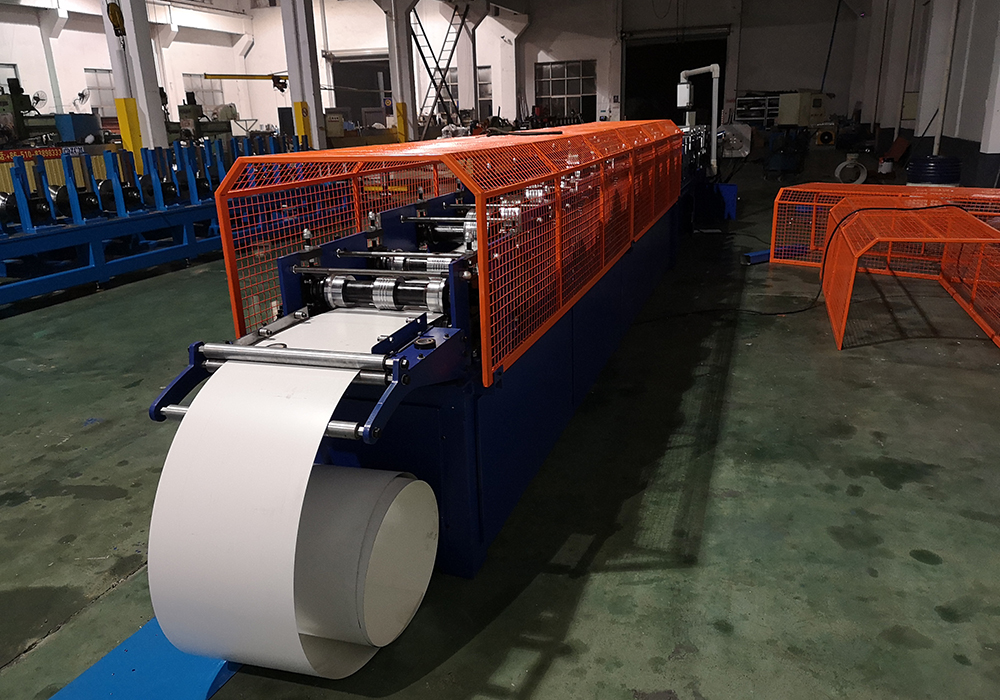 The machine is including 3T manual decoiler, drive device, roll forming machine, pinch device after forming, bending device after forming, cutting and necking down device, hydraulic system, electronic system, output table.